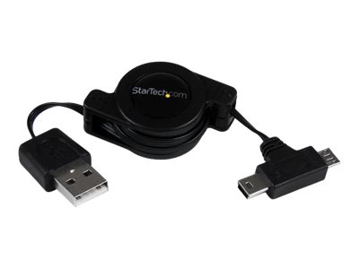 Le câble rétractable combiné USB vers Micro et Mini USB USBRETAUBMB de 76 cm permet de connecter divers appareils mobiles, comme des smartphones, tablettes ou des caméras numériques, à votre ordinateur pour effectuer vos tâches quotidiennes comme le chargement, la synchronisation de données ou les transferts de fichiers.