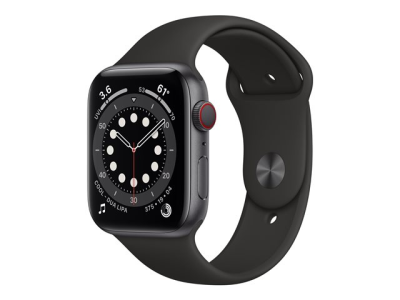Apple Watch Series 6 (GPS + Cellular) - 44 mm - espace gris en aluminium - montre intelligente avec bande sport - fluoroélastomère - noir - taille du bracelet : S/M/L - 32 Go - Wi-Fi, Bluetooth - 4G - 36.5 g MG2E3NF/A