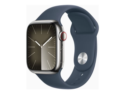 Apple Watch Series 9 (GPS + Cellular) - 41 mm - acier inoxydable argent - montre intelligente avec bande sport - fluoroélastomère - bleu orage - taille du bracelet : M/L - 64 Go - Wi-Fi, LTE, UWB, Bluetooth - 4G - 42.3 g